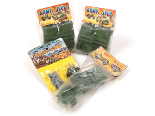 comprend : 3 sachets (ARMY JEEP & ARMY VEHICULE) contenant 5 JEEP avec remorque & un blister (BATTLE ACTION) contenant un canon, 3 soldats & différents avions de chasse - sous emballage jamais ouvert