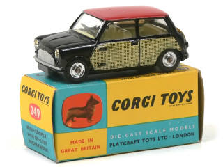 CORGI TOYS (GB) 249 MORRIS MINI COOPER noir, toit rouge, flancs canés