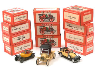 miniatures reproduisant les modèles : FORD, GAUTHIER-WEHRLE, SIZAIRE & NAUDIN, HISPANO-SUIZA, DEDION BOUTON, LION-PEUGEOT, LANDAULET PACKARD & GOBRON BRILLEE - un véhicule en état 'B' & un autre avec boîte non conforme - quelques petits manques & carrosseries légèrement encrassées
