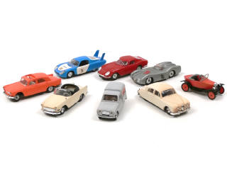 états de 'A' à 'C' - miniatures reproduisant les modèles : CITROEN (carrosserie en partie décolorée), PEUGEOT, CD, FERRARI, MERCEDES, RENAULT, SIMCA (manque antenne) & JAGUAR (carrosserie en partie décolorée)