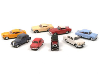 états de 'A' à 'C' - miniatures reproduisant les modèles : PEUGEOT, DKW, RENAULT, VOLKSWAGEN, VOLVO (carrosserie en partie décolorée), SIMCA (manque antenne) & FIAT (un exemplaire en partie décoloré) - quelques jantes légèrement fondues