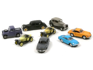 états de 'A' à 'C' - miniatures reproduisant les modèles : CITROEN (un exemplaire avec carrosserie en partie décolorée), PANHARD (manque antenne), RENAULT ALPINE, PORSCHE & LAND ROVER