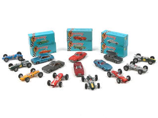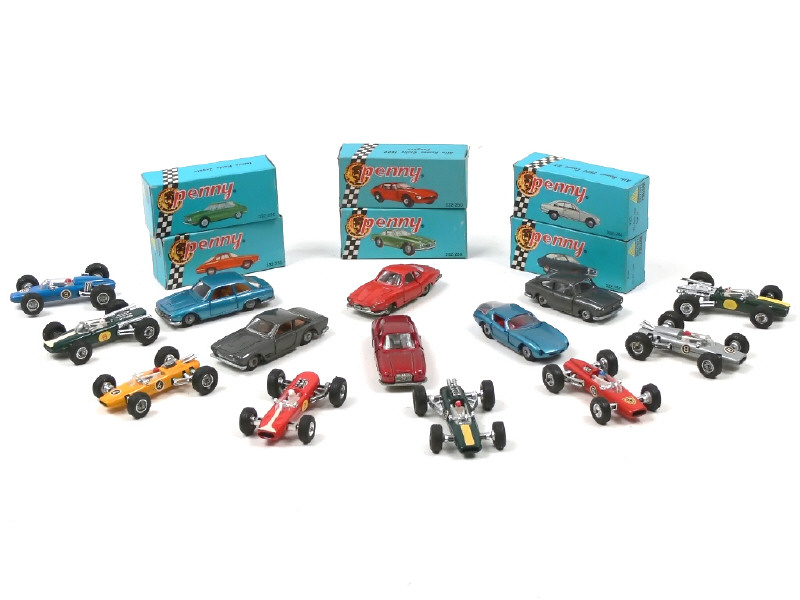 miniatures reproduisant les modèles : MASERATI, ALFA ROMEO, LANCIA, FIAT (un modèle avec traces d'humidité sur le plancher), Mc LAREN, BRABHAM, B.R.M., LOTUS-B.R.M., FERRARI, LOLA-CLIMAX & LOTUS-CLIMAX - 6 voitures avec boîte - traces d'oxydation sur quelques axes de roues
