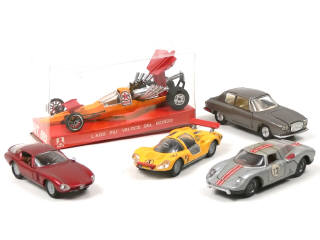 états de 'B' à 'C' - miniatures reproduisant les modèles : ALFA ROMEO, FERRARI, LANCIA & un dragster (avec boîte) - traces d'humidité sur 2 planchers, 8 jantes & une carrosserie