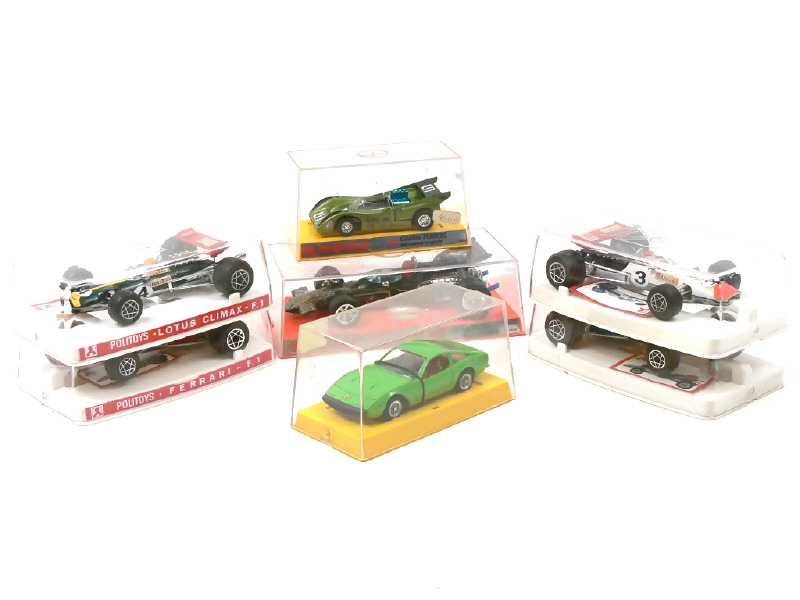 miniatures reproduisant les modèles : LOTUS CLIMAX, FERRARI, HONDA, MATRA, LOTUS & Mc LAREN - on y retrouve les marques POLITOYS & MEBETOYS