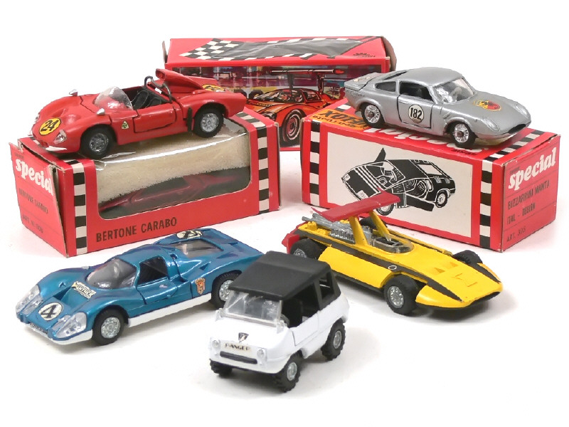 états de 'A' à 'B' - miniatures reproduisant les modèles : PANTHER, BIZZARRINI, CARABO, RANGER FERVES, FIAT ABARTH & FERRARI - 3 véhicules avec boîte & 2 autres avec quelques traces d'humidité