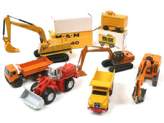 états de 'A' à 'B' - miniatures reproduisant les modèles : CATERPILLAR, O&K, MENCK, CASE, MERCEDES, MAN & ZEPPELIN - on y retrouve les marques : CONRAD, NZG & SIKU - 3 véhicules avec boîte - quelques petits manques