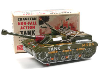 moteur à piles (fonctionne) - avec bruiteur, canon lumineux, soldat de tourelle mobile & système évitant la chute du char de sa surface de roulement - 4 petites retouches d'usine sur les angles - boîte avec marquages CRAGSTAN
