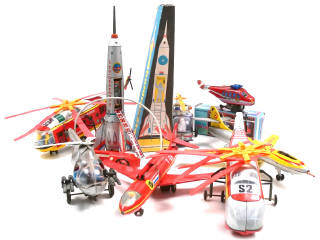 DIVERS Ensemble de 6 hélicoptères, 2 avions-fusées & une fusée en tôle lithographiée