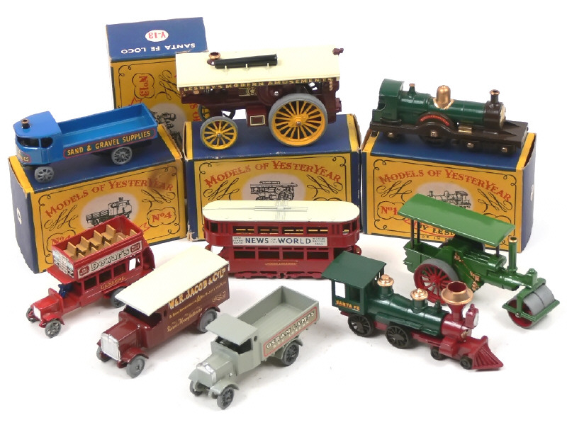 comprend : FOWLER BIG LION, locomotives à vapeur 'DUKE OF CONNAUGHT', 'SANTA FE', SENTINEL 'SAND AND GRAVEL SUPPLIES', AEC 'OSRAM LAMPS', LEYLAND 'W&R.JACOB & C°Ltd', tramway 'NEWS OF THE WORLD', bus type B 'DEWAR'S' & AVELING & PORTER rouleau-compresseur - 4 modèles avec boîte