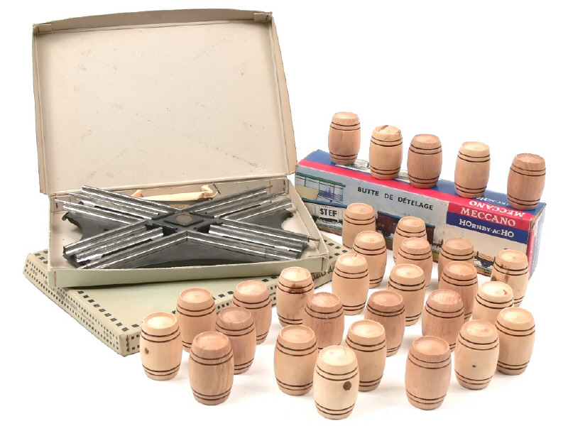 quelques parties chromées très légèrement ternies - on y joint une butte de dételage référence 6801 (en boîte, écartement HO, semble complet) & 55 tonneaux en bois