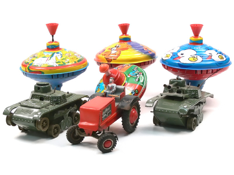 on y retrouve les marques : JOUSTRA & ARNOLD (partie repeinte & non d'origine) - on y joint 4 toupies (états de 'C' à 'D') en tôle des marques LBZ & M.H