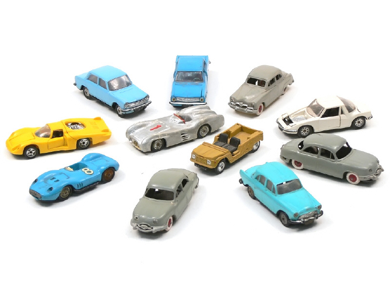 états de 'D' à 'F' - miniatures reproduisant les modèles : PANHARD (2 exemplaires), SIMCA (3 exemplaires différents), OPEL, CITROEN, MERCEDES, MASERATI, ALFA ROMEO & MATRA - quelques parties cassées - avec manques