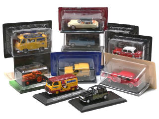miniatures reproduisant les modèles : FERRARI, SIMCA, PEUGEOT (3 exemplaires différents), CITROEN (4 exemplaires différents) & RENAULT (4 exemplaires différents) - on y retrouve notamment les marques : HACHETTE & EDITIONS ATLAS - une boîte incomplète