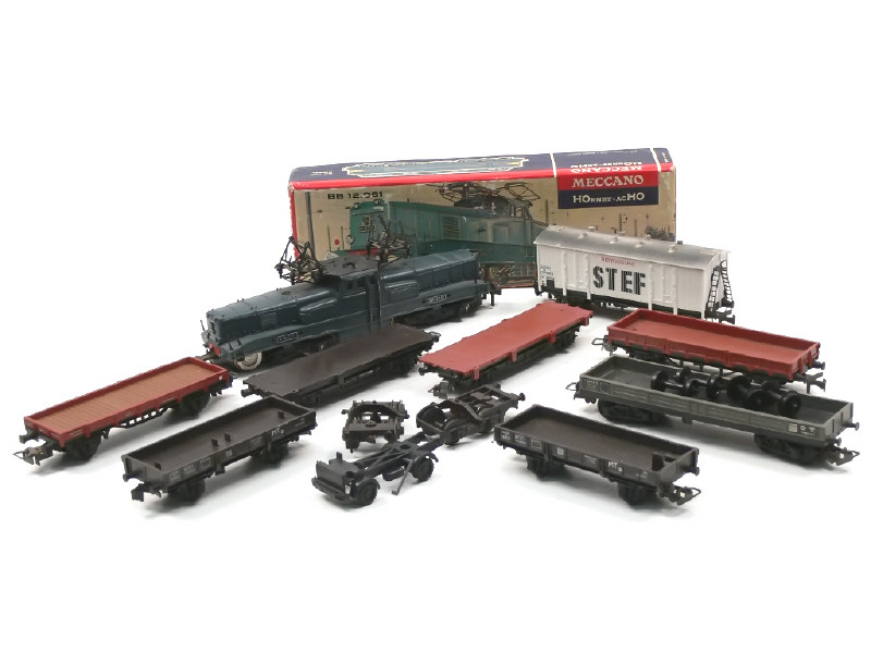 états de 'B' à 'C' - comprend : une motrice BB 12061 (parties manquantes & d'autres déformées), un wagon 'STEF', 2 plateaux à ranchers & 5 plateaux à ridelles basses - on y retrouve les marques : HORNBY, JOUEF & ELECTROTREN - avec manques - un modèle en boîte (état 'b')