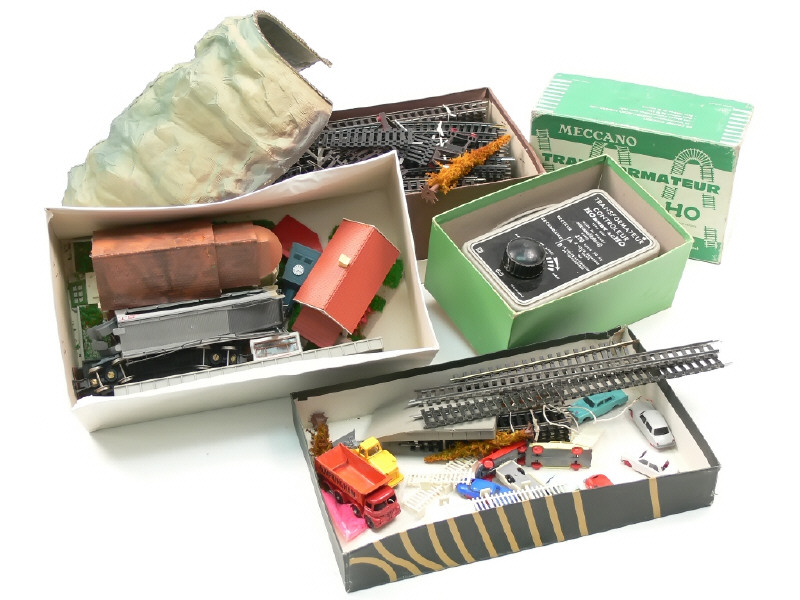 états de 'A' à 'C' - comprend notamment : transformateur type 6461 avec boîte (de la marque HORNBY), rails divers (de la marque JOUEF) & divers décors (maison, église, quai de gare, arbres, tunnel, passage à niveau, etc...)