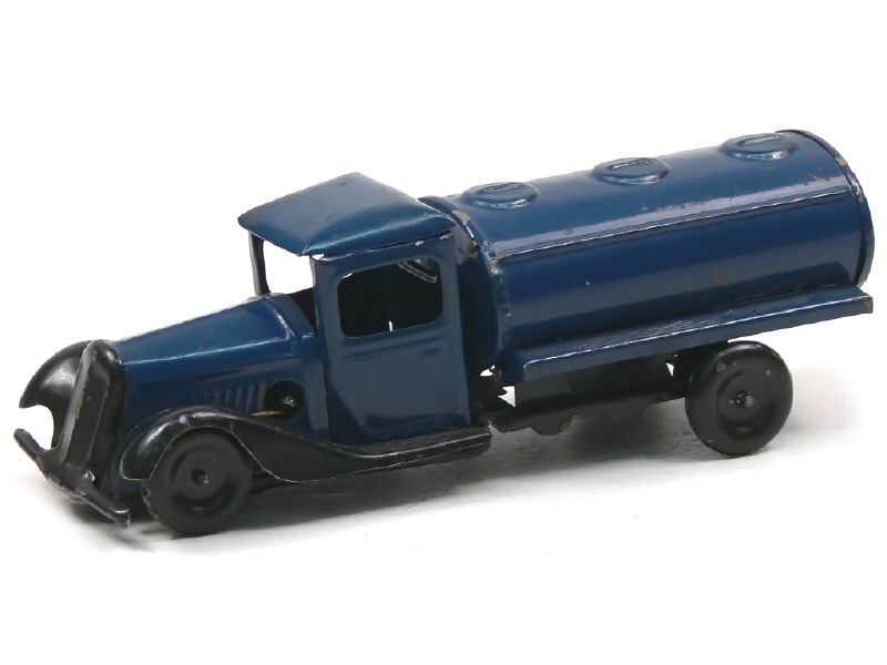 longueur 15 cm - moteur à clef (fonctionne) - version avec roues métal dont une endommagée - un embout d'axe de roues tordu