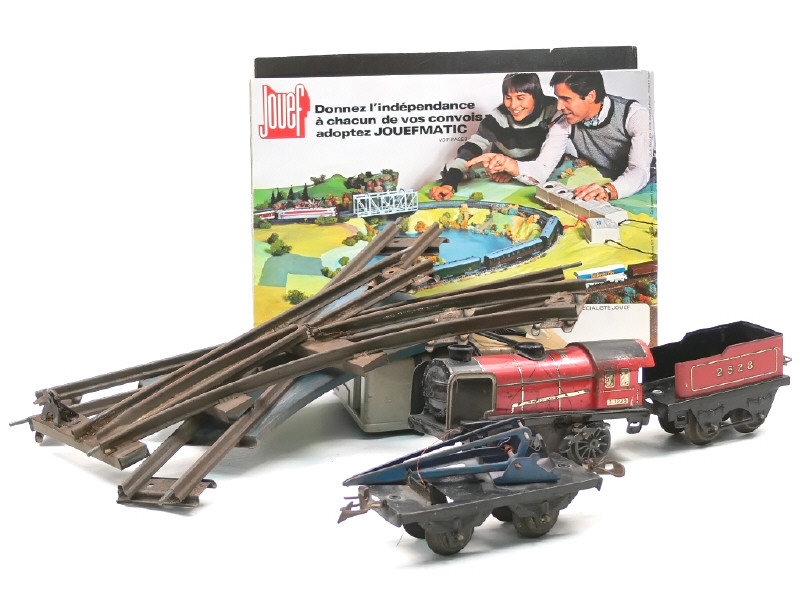 comprend : une locomotive à vapeur avec tender, un wagon-grue, un transformateur bi-tension (HO), un croisement & un aiguillage - importantes traces d'oxydation - avec manques - on y joint 2 catalogues de la marque JOUEF (HO) - on y retrouve les marques : HORNBY & JOUEF