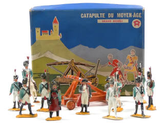 état de 'D' à 'E' - on y joint une catapulte du Moyen âge (état 'B' & 'c' - incomplète) de la marque ELASTOLIN