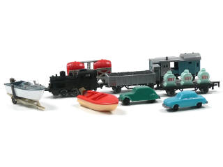 DIVERS Ensemble de 4 wagons, une locomotive, 2 voitures, 2 bateaux & une remorque
