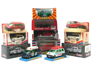 miniatures reproduisant les modèles : RENAULT (6 exemplaires différents), PEUGEOT, MORGAN, FORD (2 exemplaires différents), FERRARI & JEEP - on y retrouve les marques : DETAIL CARS, SOLIDO, REVELL, MBS & GUISVAL - un modèle avec boîte incomplète - 2 boîtes en état 'c'