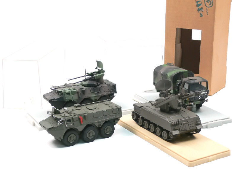 comprend : RENAULT 4x4 bâché, VAB (2 exemplaires différents dont un avec petits détails de peinture ajoutés) & un blindé avec système de missiles sol-air - un exemplaire avec boîte non d'origine & un autre sans boîte - quelques petits accessoires manquants