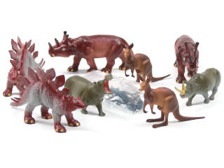 comprend : kangourous (2 exemplaires), hippopotame, uintathérium (2 exemplaires), rhinocèros laineux & stégosaure (2 exemplaires) - on y joint 11 pompiers (petite échelle)