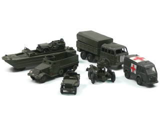 DINKY TOYS (FRANCE) Ensemble de 6 véhicules militaires & un canon kaki