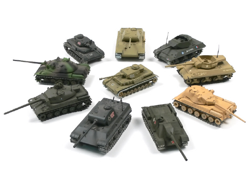 comprend : SU 100, AMX 30 (3 exemplaires différents), PANTHER (2 exemplaires différents), PANZER IV (2 exemplaires différents), M 10 & M 18 - quelques accessoires manquants