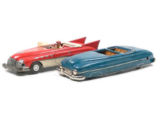 longueur 29,5 cm - moteur à clef (à revoir) - avec direction - traces d'oxydation - manque pare-brise, volant & une extrémité de pare-chocs arrière - gravures ajoutées sur un côté de la carrosserie