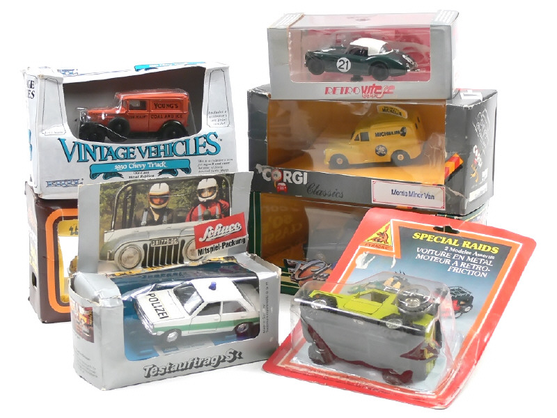 miniatures reproduisant les modèles : AUSTIN HEALEY, AUDI, CHEVROLET, MERCEDES, MORRIS, FORD & JAGUAR - on y retrouve les marques : CORGI TOYS, ERTL, SCHUCO, VITESSE & PYRAGRIC