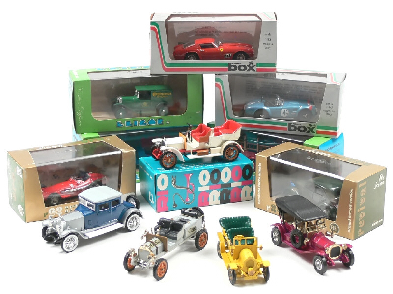 miniatures reproduisant les modèles : BUGATTI, AC COBRA, FORD, OPEL, FIAT, MERCEDES BENZ, PECHINO-PARIGI, ROLLS ROYCE, SPYKER & THOMAS - on y retrouve les marques : RIO, MODEL BOX, MATCHBOX (véhicules sans boîte), ELIGOR & BRUMM - 2 boîtes en état 'c'