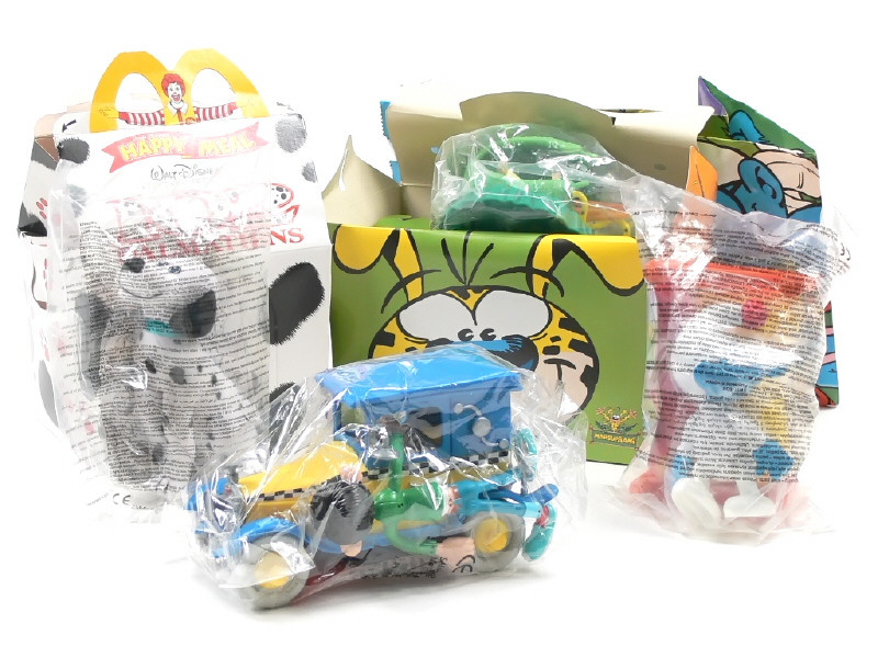 comprend : une peluche '102 DALMATIENS' en boîte 'c', MARSUPILAMI avec son nid en boîte 'c', STROUMPH avec son lit (sac MAC DONALD'S), GASTON LAGAFF avec sa voiture 'TAXI' - sous sachets jamais ouvert