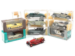 miniatures reproduisant les modèles : DUESENBERG (métal fatigue sur le capot), FORD, LANCIA, RENAULT, ROLLS ROYCE, HISPANO SUIZA, MERCEDES BENZ (2 exemplaires) & FIAT - quelques petits manques