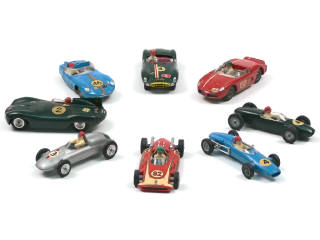 états de 'B' à 'D' - miniatures reproduisant les modèles : ALPINE, DB PANHARD, ASTON MARTIN, JAGUAR, FERRARI, HARVEY, LOTUS & PORSCHE - trace de peinture blanche sur les planchers - quelques décalques ajoutés