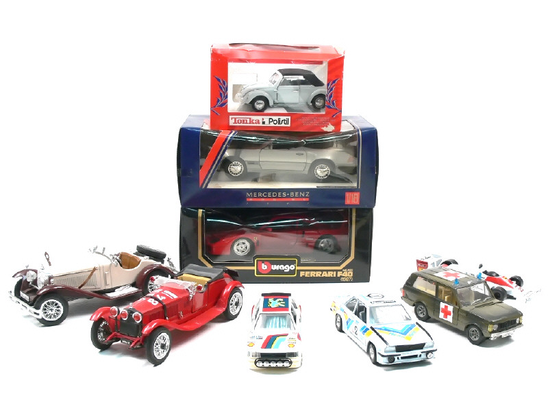 états de 'A' à 'D' - miniatures reproduisant les modèles : ALFA ROMEO (2 exemplaires), FERRARI (avec boîte en état 'b'), RANGE ROVER, MERCEDES (2 exemplaires dont un avec une boîte en état 'b'), PEUGEOT, OPEL & VOLKWAGEN (avec boîte en état 'c') - quelques petits manques