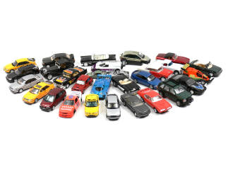 états de 'A' à 'B' - miniatures reproduisant notamment les modèles : MERCEDES, CHEVROLET, RENAULT, PONTIAC, SAAB, JEEP & JAGUAR - on y retrouve les marques : ROAD CHAMP, MC TOYS, SHB, RACING CHAMPIONS, UNIVERSAL HOBBIES & HONGWELL - 2 voitures de petite échelle - quelques manques
