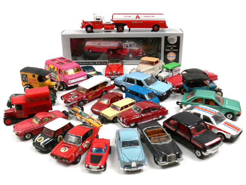 états de 'A' à 'C' - miniatures reproduisant notamment les modèles : JAGUAR, VOLVO, SAAB, PONTIAC, RENAULT, FORD, MERCEDES, CHEVROLET, COOPER-MASERATI, MACK, BERTONE RUNABOUT, LANCIA & MORRIS - un camion avec boîte - quelques véhicules repeints & transformés (7 autres de petite échelle) - quelques manques