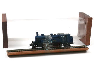 présentée sur rail avec boîtage cylindrique spécifique en plastique & bois - modèle maintenu par 2 rubans adhésifs - quelques petits accessoires manquants