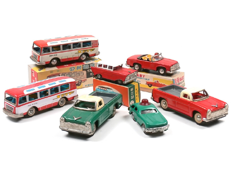 comprend : 2 autocars, 2 pick-up, un break, un cabriolet & une voiture de police - 3 modèles en boîte (en état 'b') - on y retrouve principalement la marque MF - quelques petites traces d'oxydation