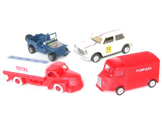 état de 'A' à 'C' - miniatures reproduisant les modèles : JEEP, CITROEN, BERLIET & AUSTIN MINI - on y retrouve les marques : SAFIR, CLE (manque antenne), VAPE BOURBON (un montant de pare-brise casé) & GOZAN