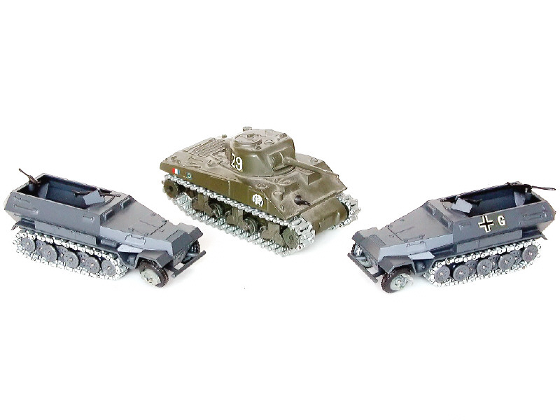 état de 'A' à 'B' - miniatures reproduisant les modèles : SHERMAN (manque antenne & décalques incomplets) & HANOMAG (jantes fondues)