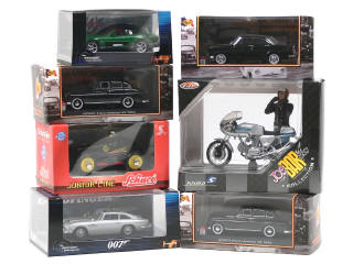 comprend notamment : FORD VEDETTE V8 1954 (2 exemplaires), SIMCA VERSAILLES 1956, ASTON MARTIN DB 5, JAGUAR XKR & DUCATI 900 SS - on y retrouve les marques : SCHUCO, NOSTALGIE (une boîte en état 'c'), SOLIDO & MINICHAMPS (collection 'James BOND')