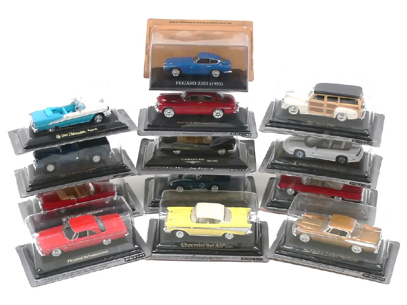 véhicules vendus en kiosque - miniatures reproduisant les modèles : CADILLAC, BUICK, CHEVROLET, FORD, PONTIAC, MERCURY, PEGASO, SALEEN, STUDEBAKER, PLYMOUTH & DUESENBERG - 3 véhicules de la marque SOLIDO - 3 boîtes en état 'c'