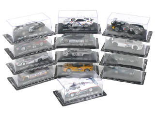 véhicules vendus en kiosque - miniatures reproduisant les modèles : ASTON MARTIN, AUDI, BMW, CHEVROLET, CHRYSLER (de la marque ALTAYA), DALLARA, FORD, JAGUAR, MAZDA, NISSAN, PANHARD, PANOZ, PEUGEOT, PORSCHE, RENAULT, REYNARD, RONDEAU, SALEEN & MERCEDES