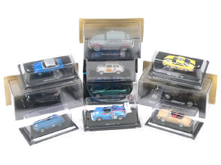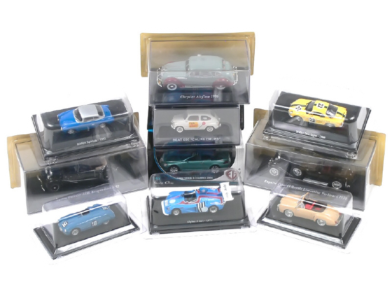véhicules vendus en kiosque - miniatures reproduisant les modèles : ALFA ROMEO (de la marque VEREM), ALPINE, AUSTRO DAIMLER, BUGATTI, CHRYSLER, BMS, DURIEZ, MERCEDES, REDELE, ROSENGART, SEAT, TOYOTA (de la marque SOLIDO), VUTOTAL, VOLKSWAGEN & WILLYS