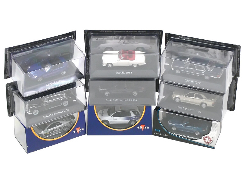 véhicules vendus en kiosque - miniatures reproduisant notamment les modèles : 160A, C200, 220SE, 230SL, 260D, 300SL, 300SC, SLR Mc LAREN, S500 & 280SE - une CLK DTM & une ML430 de la marque ALTAYA - une voiture désolidarisée du socle