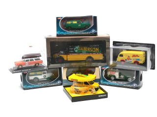 miniatures reproduisant notamment les modèles : BERLIET, AUSTIN, DKW, PEUGEOT, CITROEN, SAVIEM, SIMCA, DODGE & RENAULT - on y retrouve notamment les marques : SOLIDO & NOREV - un véhicule avec châssis désolidarisé de la carrosserie (en boîte état 'c')