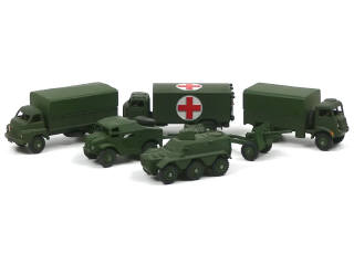 DINKY TOYS (GB) Ensemble de 5 véhicules militaires, une remorque à munitions & un canon