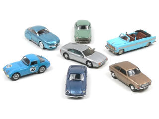 miniatures reproduisant les modèles : FIAT cabriolet limousine, SIMCA GORDINI, PEUGEOT 204 coupé, RENAULT FREGATE, MVS VENTURI (état 'E'), GREGOIRE (manque un essuie-glace) & ASA 1000 coupé - on y retrouve notamment les marques : MASTER 43, AQUAVIT, DUVI, MOG MODELES, BIZARRE & EXEM